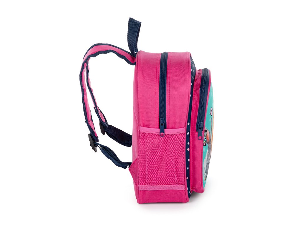 - má jednu velkou kapsu, menší kapsu na svačinu a postranní kapsičky na lahev na pití