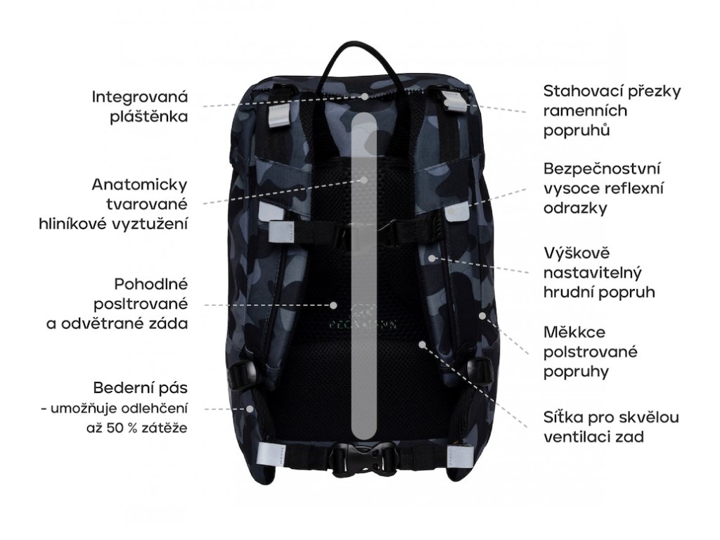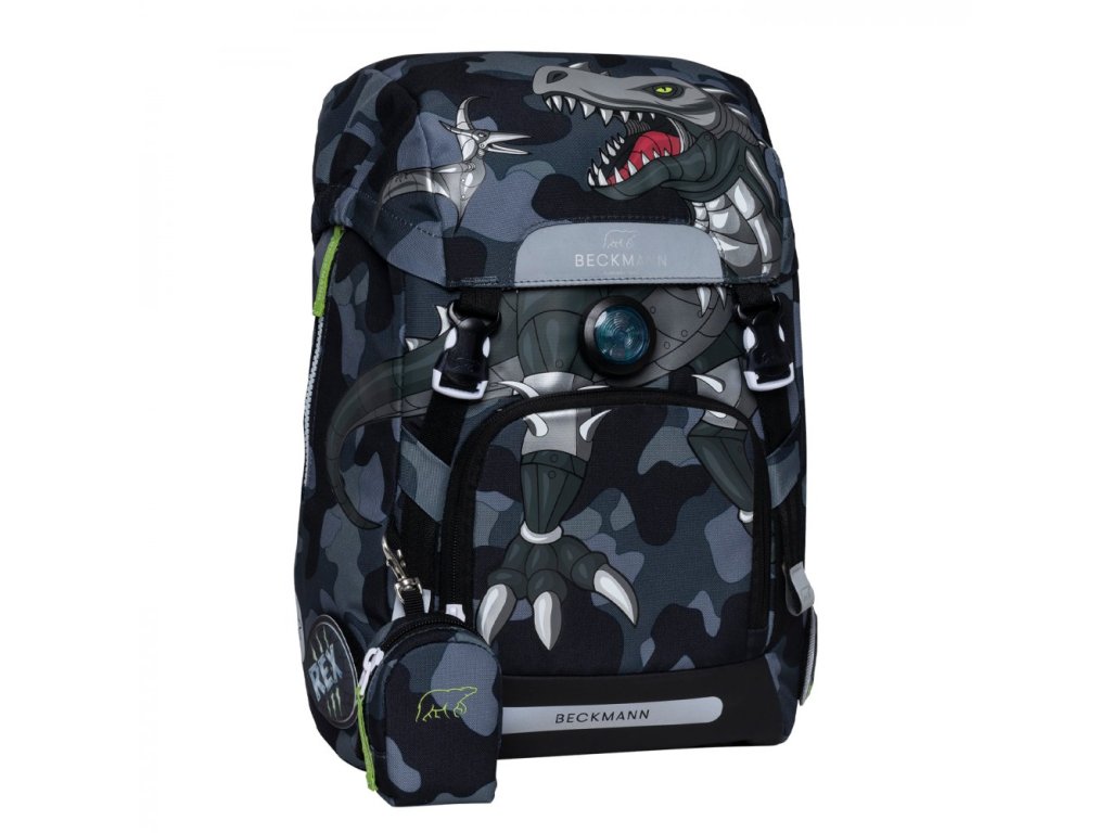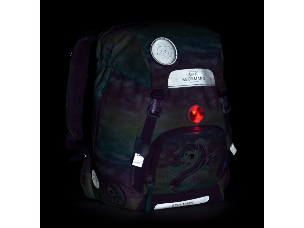 - nadstandartní výbava - originální obracecí přední kapsa, která po obrácení, promění batoh na batoh bez obrázku (batoh 2v1 - patent BECKMANN), pláštěnka, diodové světýlko i hravé měnitelné obrázkové placky, které jsou také v ceně