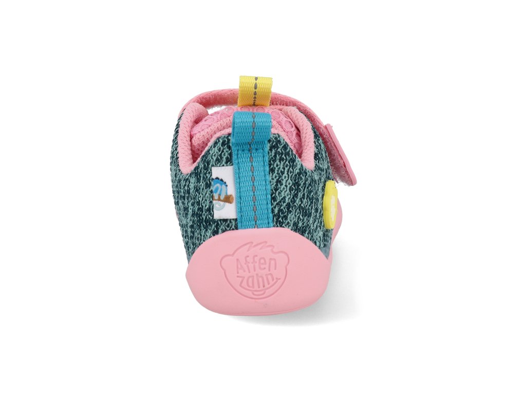 Dětské tenisky Affenzahn z polyesterového vlákna mají ergonomický střih, který respektuje přirozený tvar dětské nohy. Tenká, pružná a dobře přilnavá podrážka podporuje přirozený pohyb, správné odvalování chodidla a díky dostatečnému prostoru pro prsty umožňuje zdravý vývoj dětských nohou. Zapínání na suché zipy usnadňuje dětem samostatné obouvání a prodyšný svršek je ideální do teplých letních dnů. Reflexní prvek na patě zvyšuje viditelnost při pohybu venku, zatímco pevně přišitá podrážka brání tomu, aby se pod ni dostával písek či drobné kamínky. O zábavný vzhled se stará typický hravý design Affenzahn s roztomilými detaily, který děti prostě milují